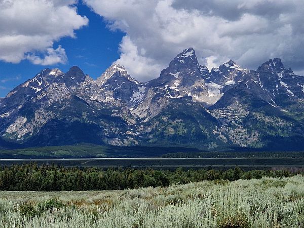 Der Buffalo Fork River, in der Nähe von Moran, ist ein Nebenfluss des Snake River. Gespeist vom North Fork-, Soda Fork- und dem South Fork River, sollte man den 55 Meilen langen Buffalo Fork eigentlich „Fliegenfischer's Traum-Fluß“ nennen. Im Bereich am Highway sind ein paar Meilen Privat-Land und Gäste-Farmen, aber weiter unten in der Ebene zum Snake River wo die Cutthroat-Forellen hochziehen ist überall viel Fliegenfischen möglich. Wir sind weiter flußaufwärts gefahren bis zur Turpin Meadow Ranch und dem gleichnamigen Campground, ab hier wird der Buffalo Fork schmäler und wilder, hier endet die Straße und Fliegenfischen-Wandern ist möglich. In diesem Gebiet hat man einen grandiosen Blick auf die hohen Berge der Teton Range (bis zu 4200m) im Grand Teton National Park.