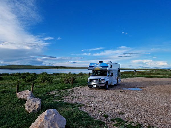 Wohnmobil-Abholung (Denver/Colorado) ist überlicherweise am Nachmittag, somit war unser Ziel zuerst die Stadt Laramie/Wyoming, ca. 2,5 Stunden entfernt. Noch Essens-Vorräte im Walmart einkaufen, dann waren wir am frühen Abend an unserem ersten (kostenfreien) Camp-Stellplatz, wenige Meilen vom Laramie-Stadtzentrum entfernt, am Gelatt-Lake (siehe Bilder oben).